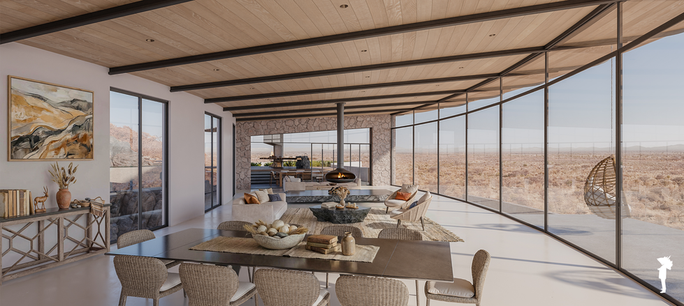 Set into the rugged hillside in Northern Namibia, the house is conceived as a series of horizontal planes that extend from the existing terrain. Locally textured stone walls anchor the structure to the slope, while a lightweight glazed pavilion floats above, framing expansive views and drawing warm desert light deep into the interior.